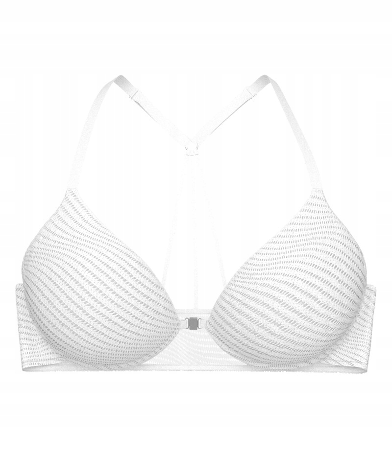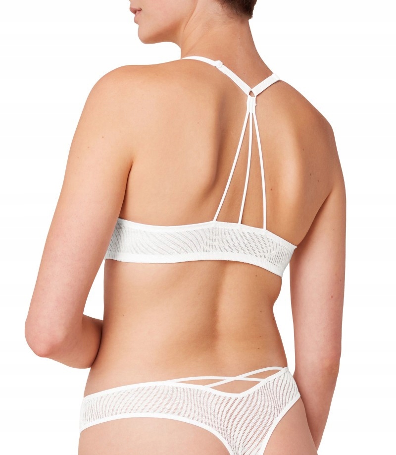 Biustonosz zapinany jest z przodu na ozdobną haftkę, a jego tył zdobi finezyjna koronka z dekoracyjnymi paskami, które nadają całości wyjątkowego charakteru. Termicznie formowana koronka pozostaje gładka i niewidoczna pod dopasowaną odzieżą.