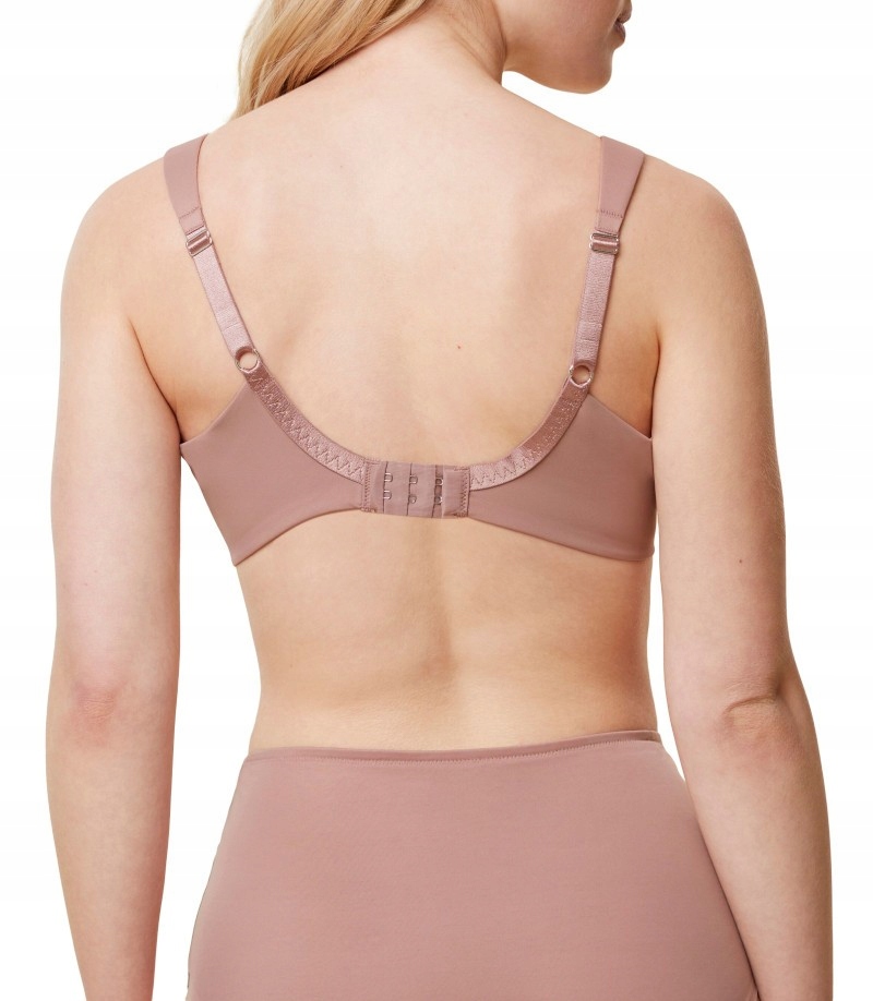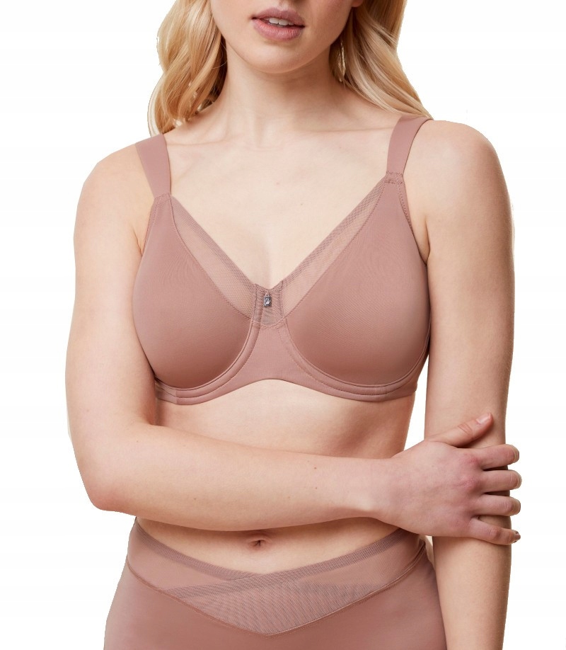 Szerokie boki z siateczkowym wypełnieniem delikatnie podtrzymują konstrukcję, pozostając niewidoczne nawet pod dopasowanymi ubraniami. Ramiączka są szerokie, lekko wyściełane i w pełni regulowane, co umożliwia perfekcyjne dopasowanie do sylwetki. Biustonosz zapinany jest z tyłu na trójstopniową haftkę pozbawioną niklu, co czyni go odpowiednim również dla osób o skórze wrażliwej.