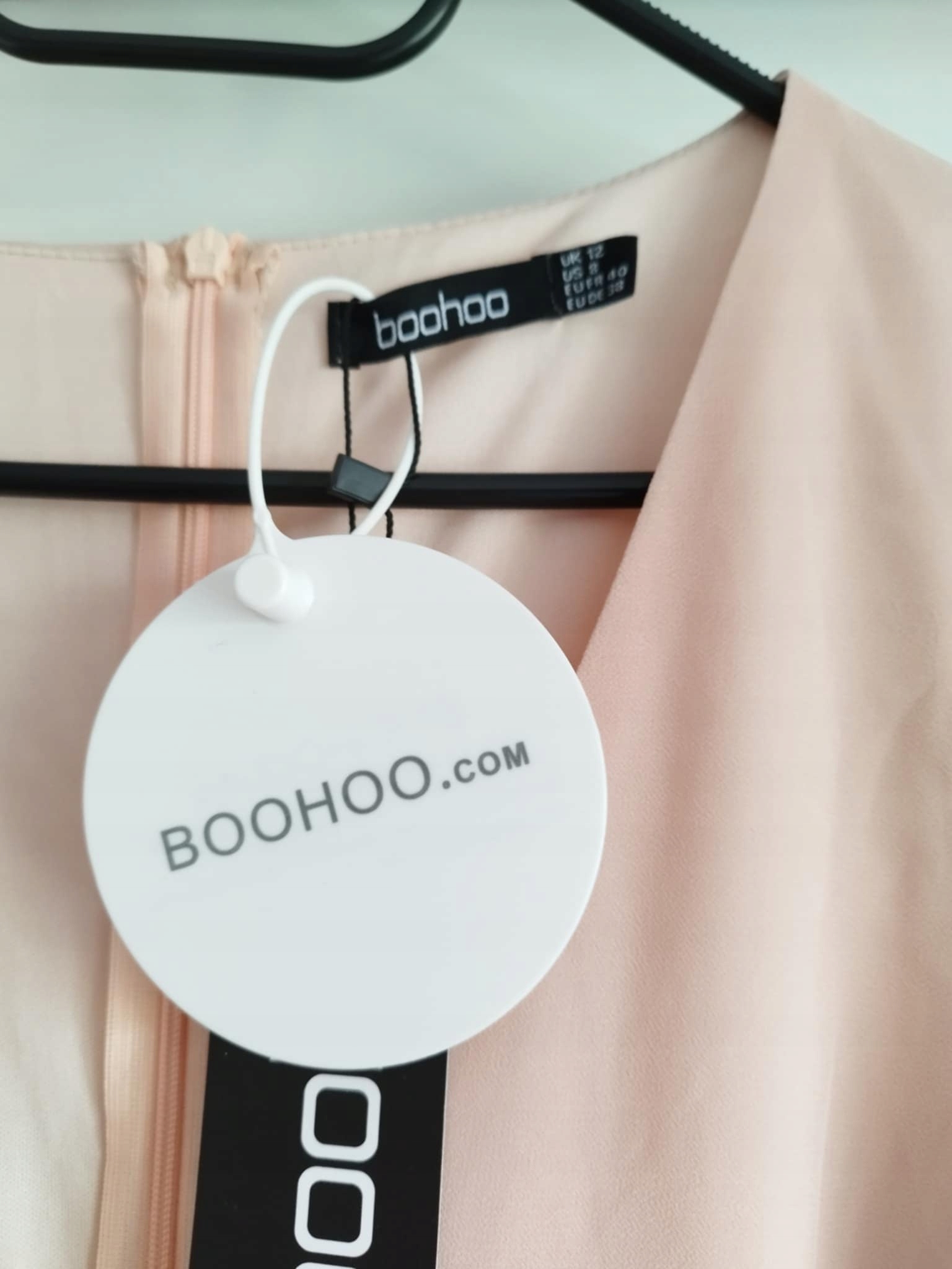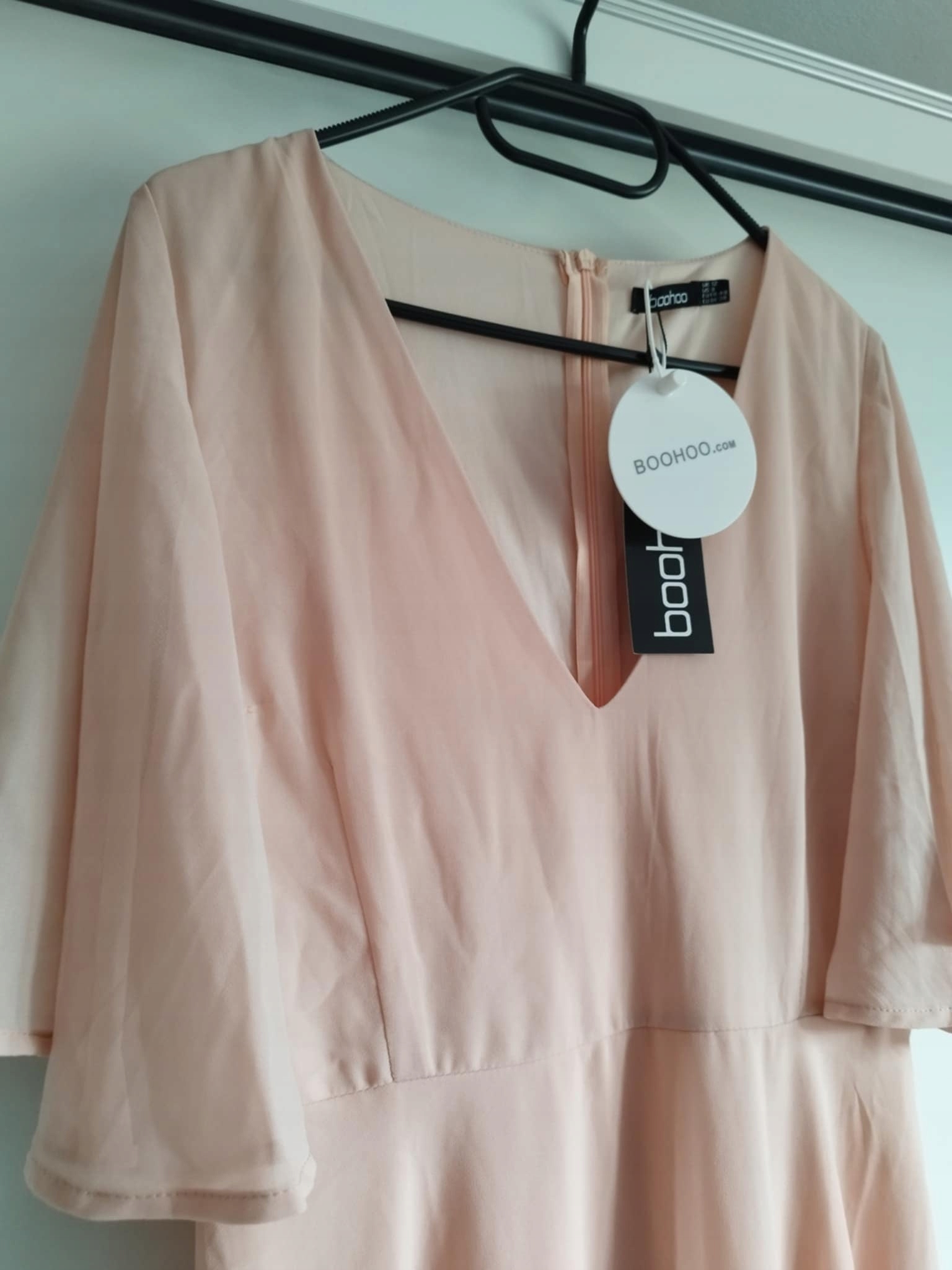 Elegancka i kobieca sukienka midi marki Boohoo w odcieniu pudrowego różu. Model o luźnym, zwiewnym kroju, wykonany z lekkiego materiału, który pięknie układa się w ruchu. Posiada dekolt w kształcie litery V, który subtelnie podkreśla szyję i obojczyki, oraz rozkloszowane rękawy nadające całości romantycznego charakteru. Idealna na wesela, przyjęcia, randki czy letnie okazje.