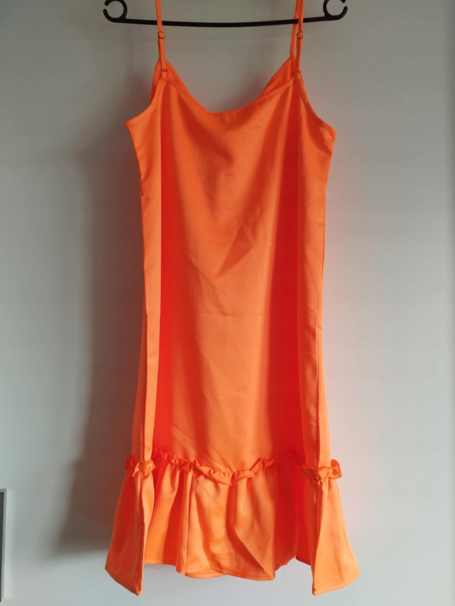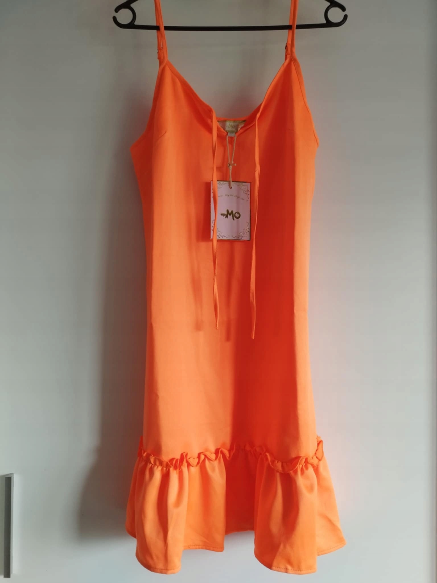 Energetyczna sukienka marki MyMo w intensywnym neonowym pomarańczowym kolorze to idealna propozycja na lato. Model na cienkich, regulowanych ramiączkach zapewnia komfort i możliwość dopasowania do sylwetki. Sukienka ma prosty, lekko luźny krój, który kończy się efektowną falbaną u dołu, dodającą dziewczęcego charakteru.