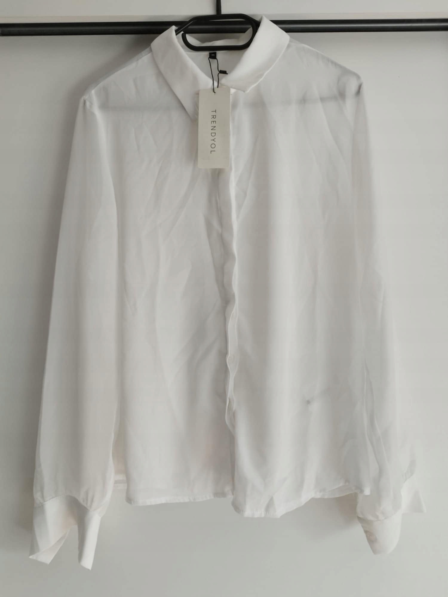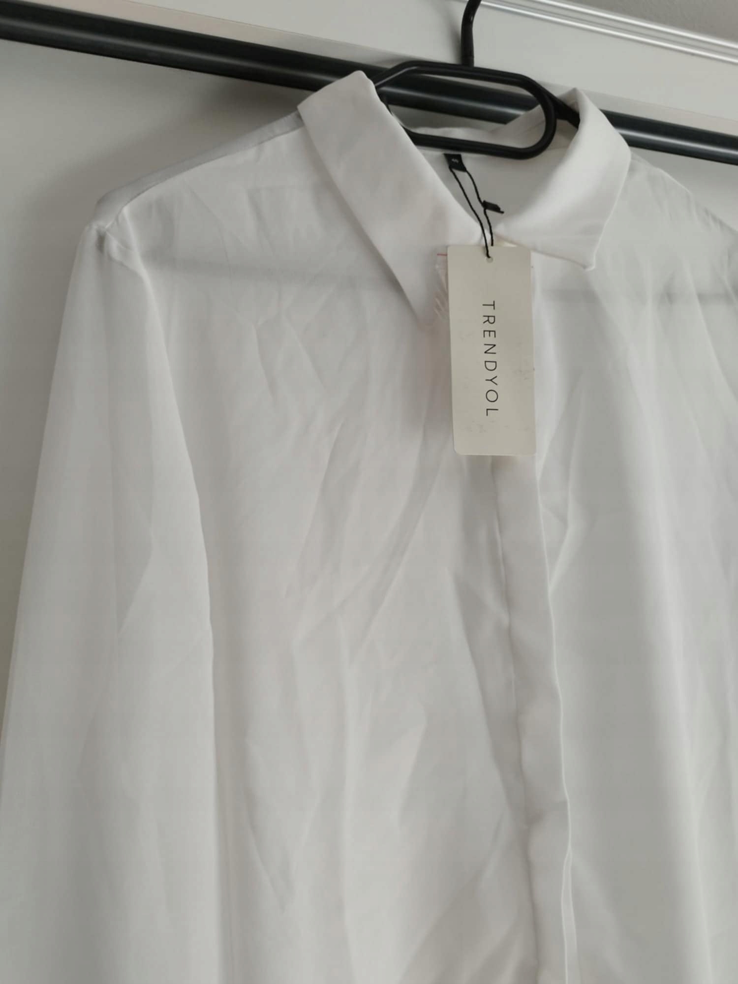 Elegancka koszula marki Trendyol to klasyk, który sprawdzi się zarówno w stylizacjach biurowych, jak i casualowych. Model wykonany z lekkiej, pół transparentnej tkaniny o subtelnym połysku, która pięknie układa się na sylwetce i zapewnia komfort przez cały dzień.