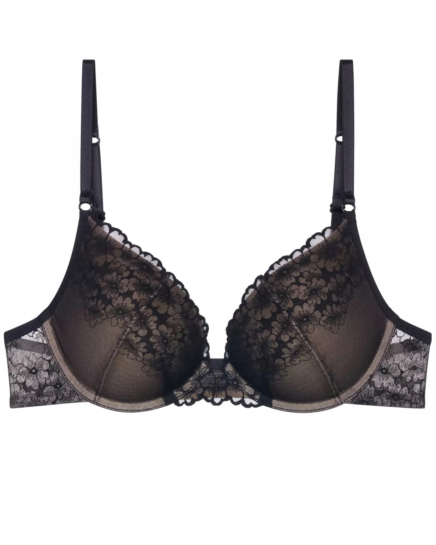 Biustonosz posiada usztywniane, termicznie formowane miseczki ze zintegrowanym efektem push-up, który subtelnie unosi biust, modeluje go i eksponuje dekolt. Dzięki temu piersi zyskują piękny, naturalny kształt, a sylwetka nabiera wyrafinowanej elegancji. Modelowane fiszbiny zapewniają dodatkowe podtrzymanie i stabilizację, co jest szczególnie ważne przy codziennym użytkowaniu.
