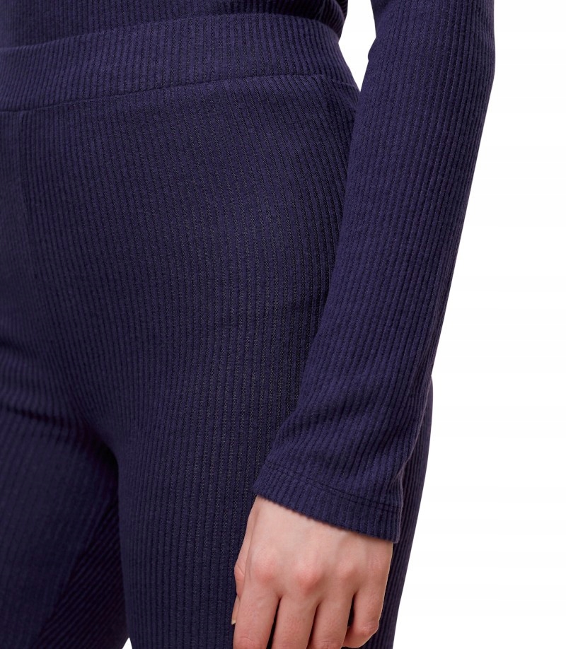 Spodnie posiadają elastyczny ściągacz w pasie, który nie krępuje ruchów i dopasowuje się do sylwetki. Prążkowana dzianina dodaje im nowoczesnego charakteru, a naturalne i trwałe materiały gwarantują wygodę użytkowania.