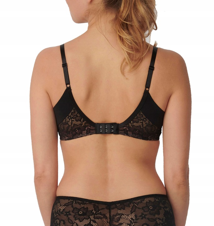 Ramiączka mają satynowy połysk, są regulowane, lecz nieodpinane, co gwarantuje trwałość i pewne podtrzymanie biustu. Tył modelu zapinany jest na haftki z trójstopniową regulacją obwodu, umożliwiając idealne dopasowanie do indywidualnych potrzeb.